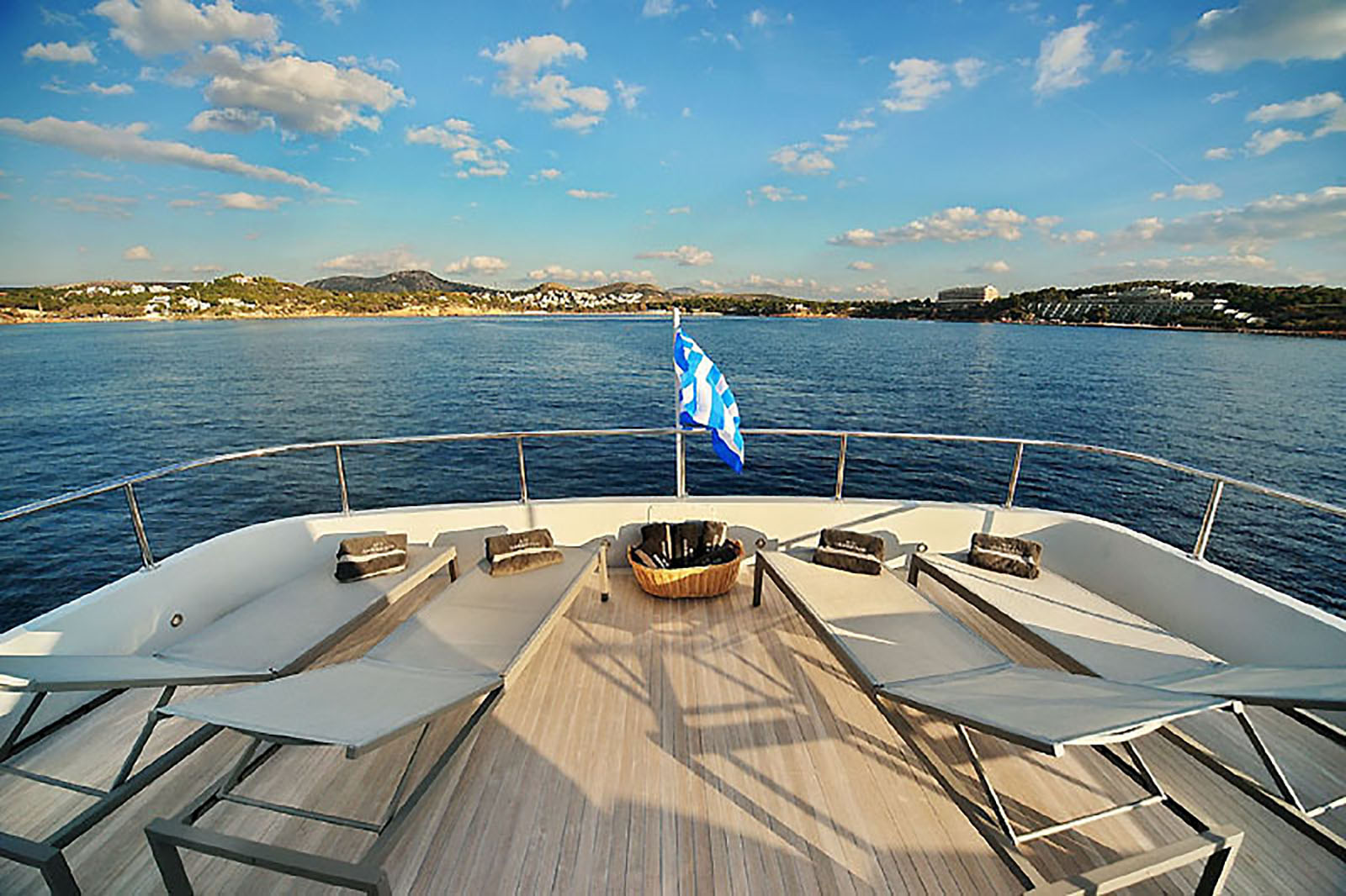 The sun deck boasts a half moon sofa with two tables and sunbathing mattress.