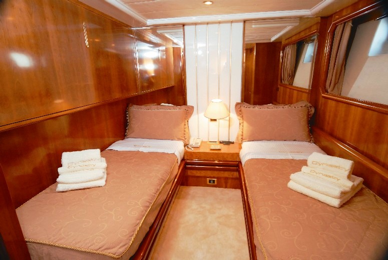 M/Y Dynasty can accommodate 8-10 guests in one full beam master cabin, a full beam VIP cabin and two twin cabins with pullman berth. All cabins have ensuite facilities. All cabins and the salon are fitted with Sat LCD TV/DVD/CD Player and both twin cabins have Playstation II.