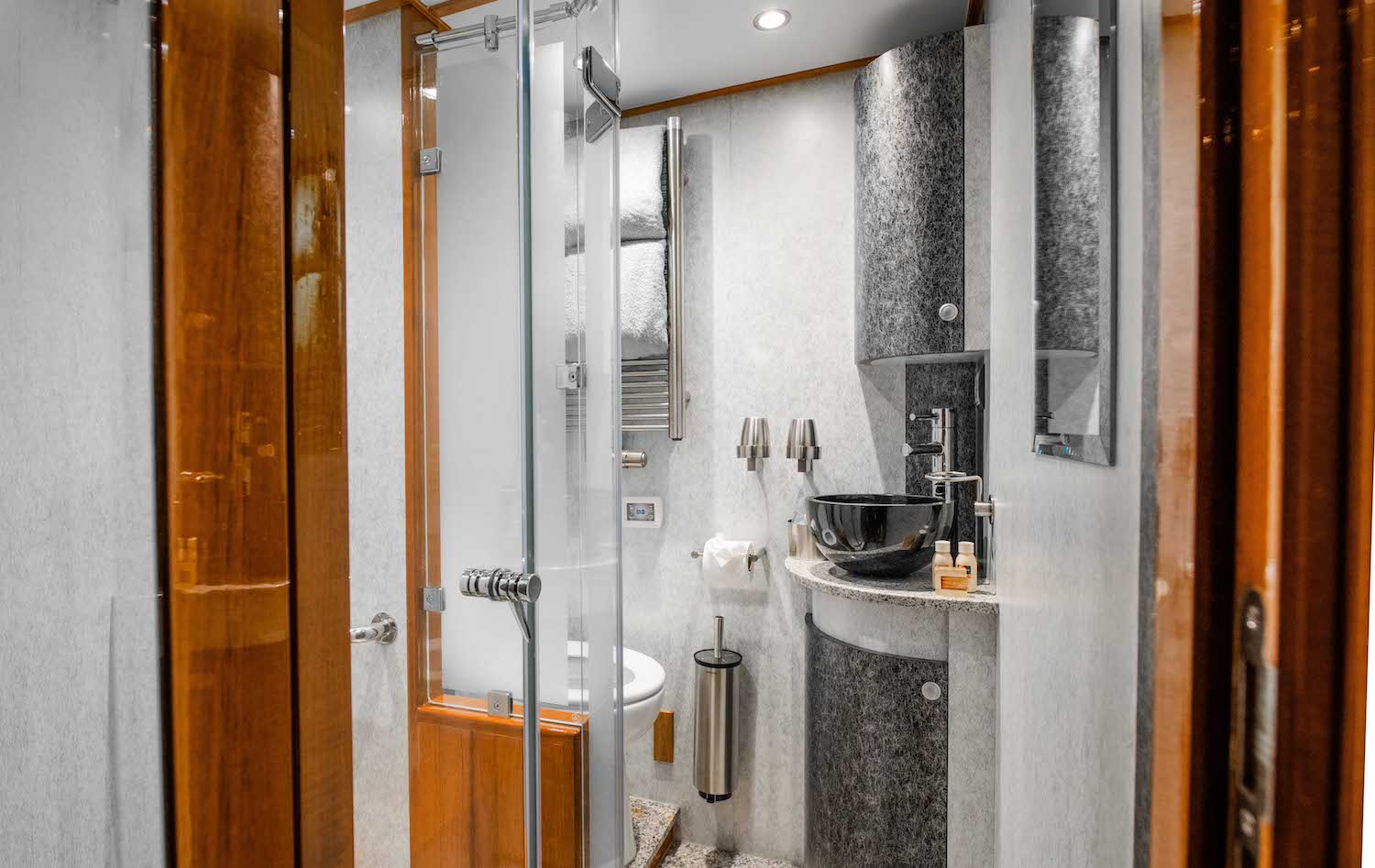 The yachts Master cabin offers a queen-size bed with luxurious mattress, spacious lockers, built-in stereo and Flatscreen TV and luxury en-suite bathroom with flush toilet and separate shower with marble interior. The double cabin also has spacious lockers and an en-suite bathroom with separate showers and flush toilets.
