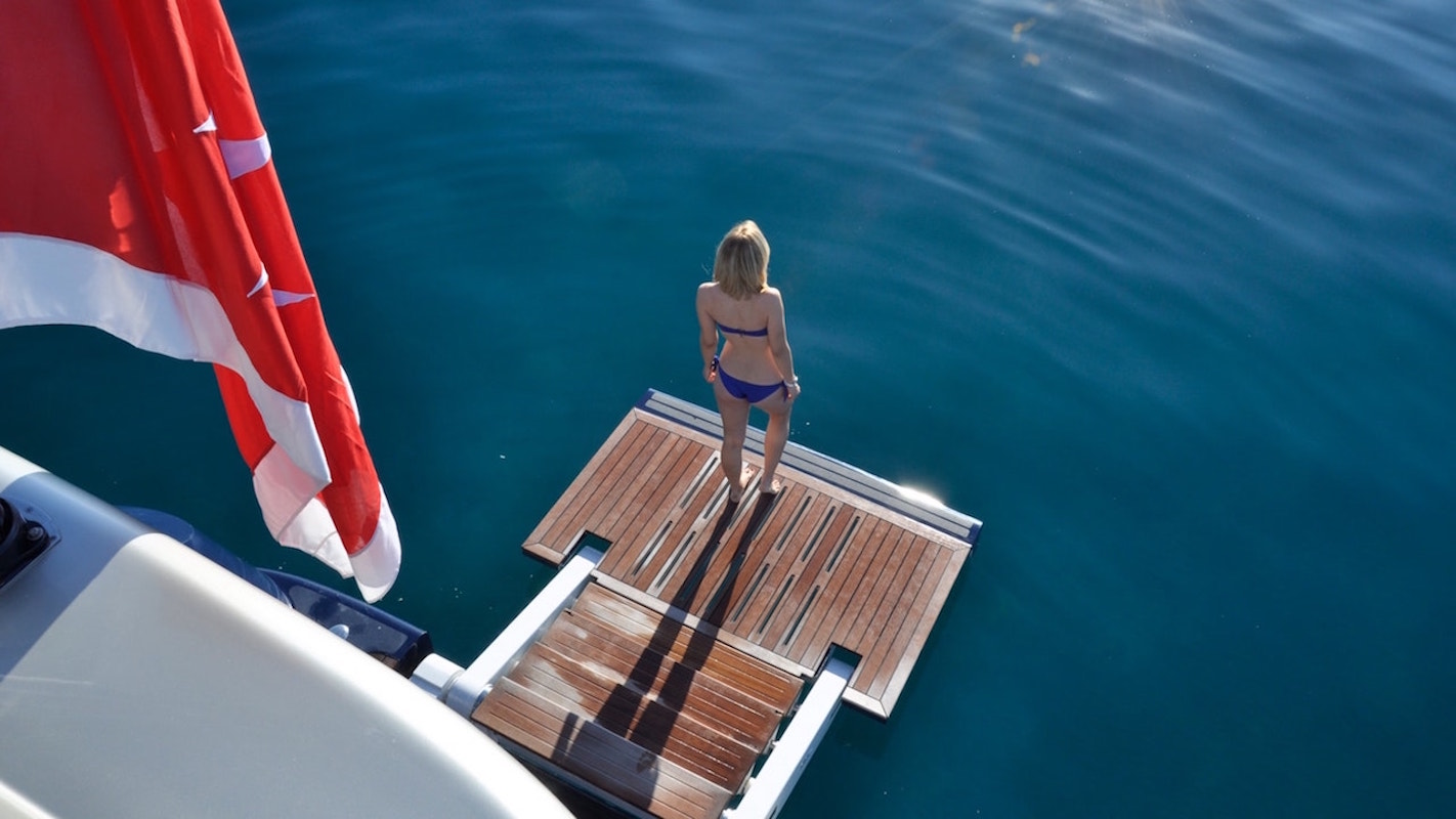 The spacious main salon is located on the main deck and has a lounge and a dining area. The sky lounge features a bar, a flat-screen TV, and a lovely seating area to enjoy some breathtaking panoramic views. The foredeck hosts a large Jacuzzi, while the upper deck aft is a perfect place for alfresco dining.