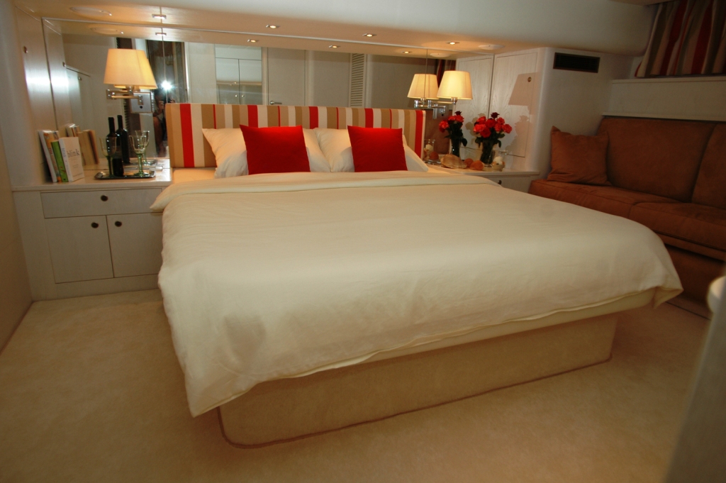 Motor yacht FIRST BLUE can accommodate up to 6 guests in 2 cabins. The master and VIP cabin have King sized beds (1.80 x 2.00) and the Kids Cabin is used as Captain's cabin.