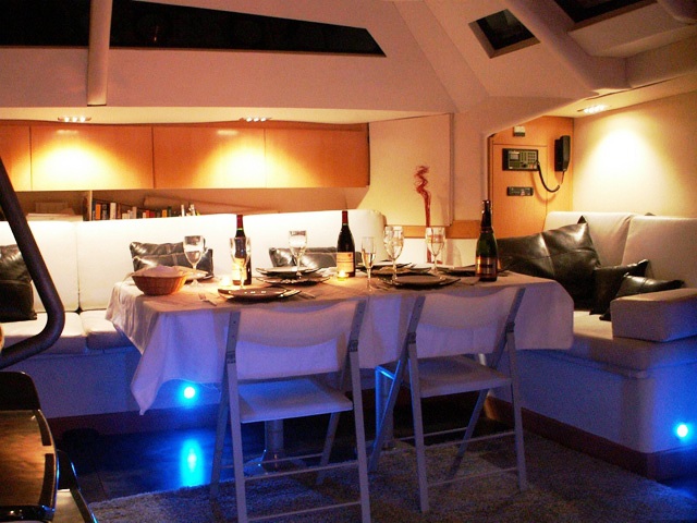 Fitted with pale leather sofas and a large table, the main salon is inviting and comfortable. The walls and overheads are white and the minimal cabinetry is pale wood to contrast with the dark cabin sole.