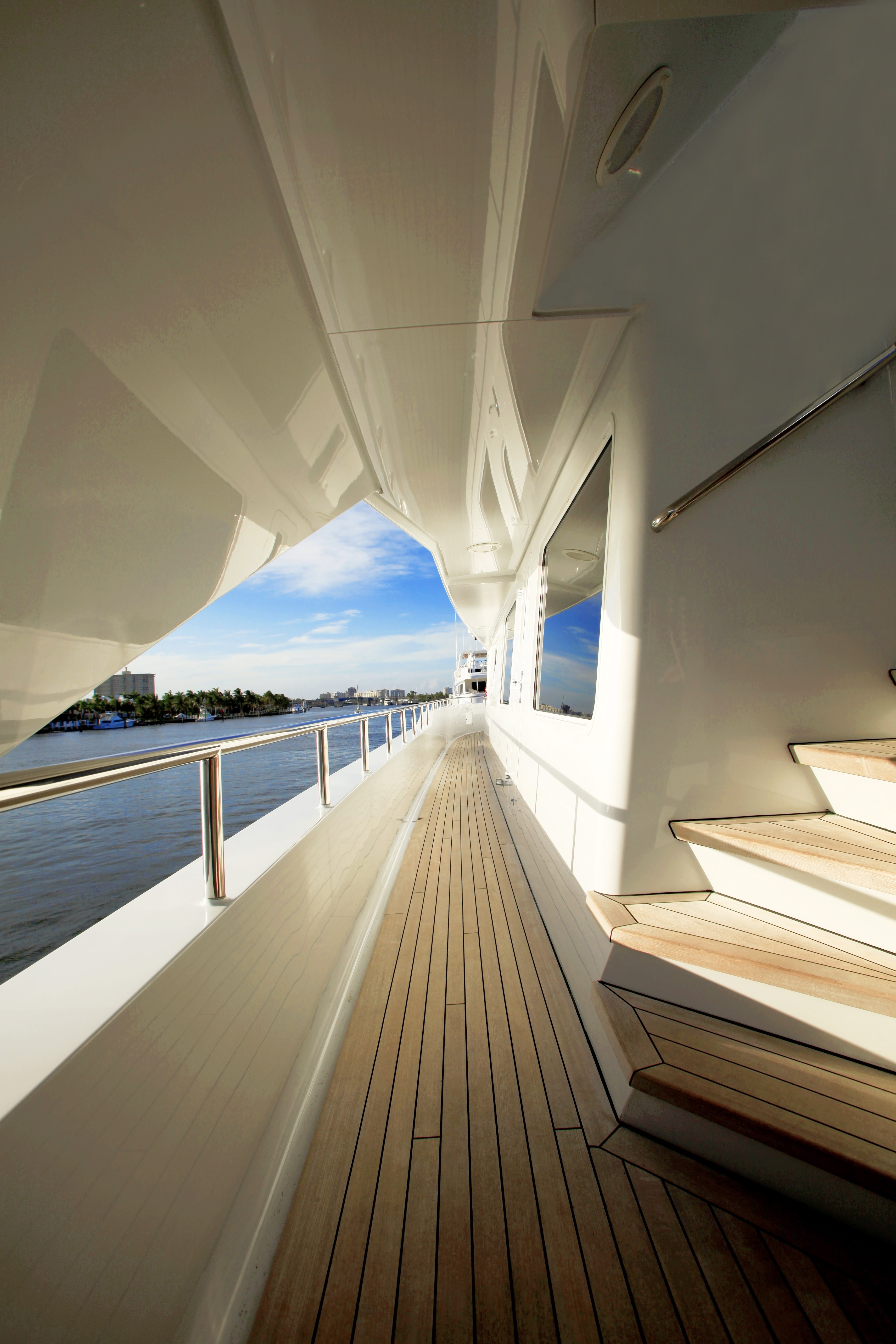 A spiral staircase divides the salon from the dining area and stretches from the accommodation on the lower floor to the bridge deck and sky lounge. The sky lounge features a full wet bar with stools, comfortable seating and sliding doors with access to the aft deck dining and seating area.