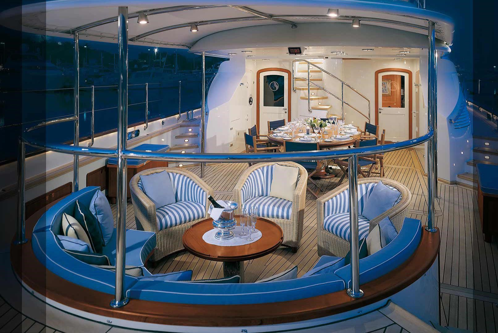 The exterior form is in the style of the typical Perini Navi yachts of the 1990s, which is more tradition-bound, with a classic aft-raking transom, elongated flying bridge sundeck, and raised wheelhouse.