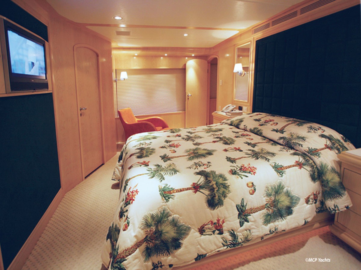 The En-suite bathroom has an oversized shower, with bench seat, head and sink. All staterooms have a Crestron audio system with surround sound, reading lights next to the beds, complete blackout blinds, hairdryers, and port holes allowing natural light to filter the lower deck.