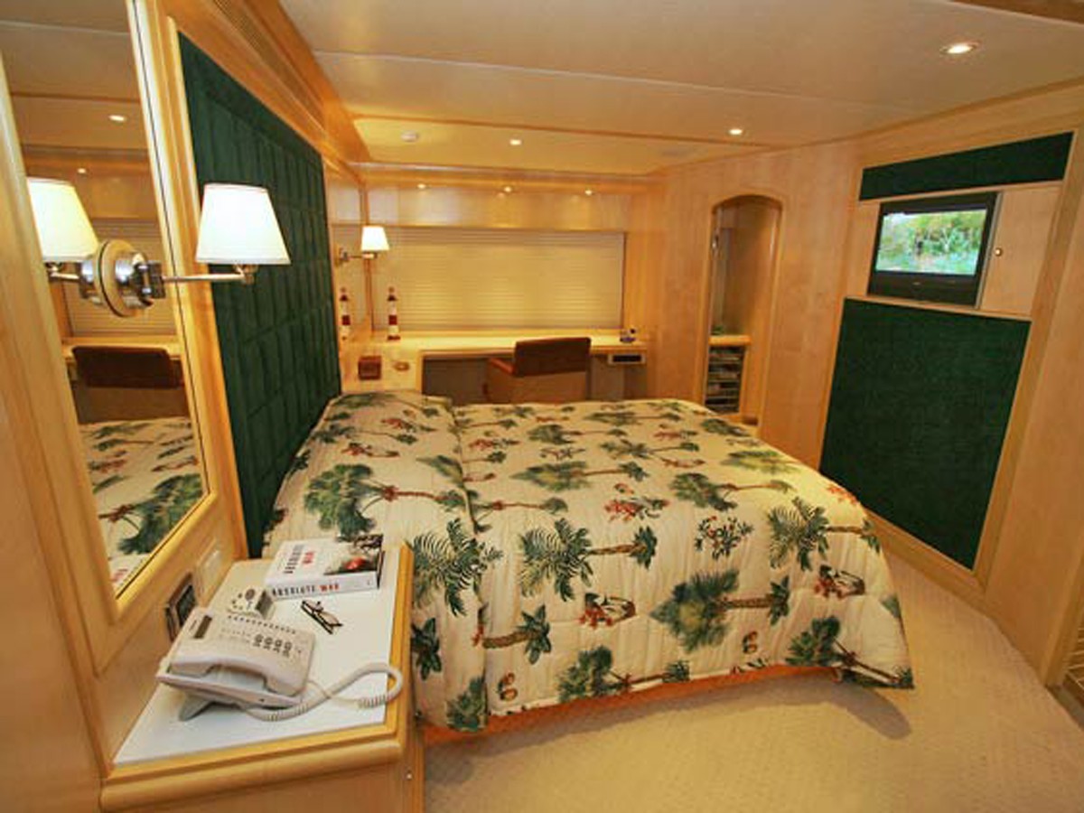Her on deck master stateroom has a walk-around queen bed, a 26” TV with Direct TV individual satellite receiver, a desk with drawers to port with large OBLO viewing windows, two of which can open. There is a reading chair to starboard, as well as a walk-in closet forward to port.