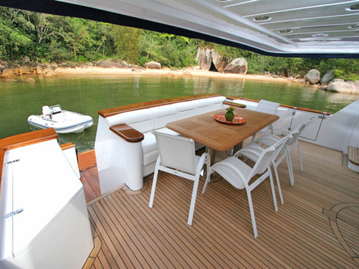 Sun cushions astern and sofa seats and cushions forward on either side. There is also a convenient Wet bar with fridge and icemaker.