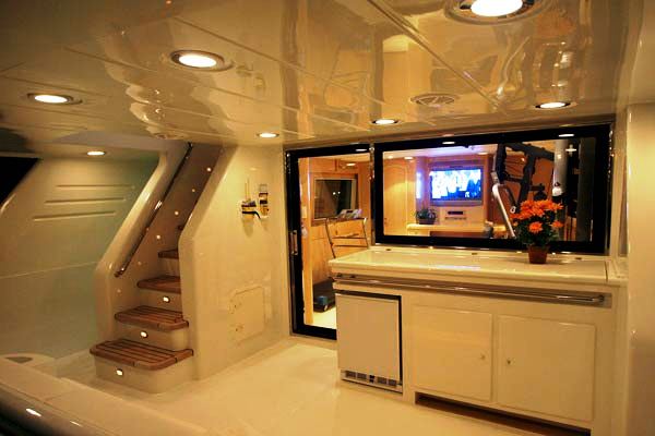 Sun cushions astern and sofa seats and cushions forward on either side. There is also a convenient Wet bar with fridge and icemaker.