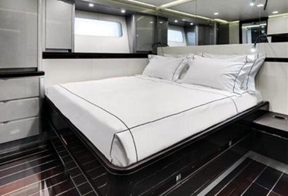 Her full width master cabin can be partitioned to create a smaller master cabin plus twin bunk cabin arrangement. The “his and hers” ensuite bathrooms in the master cabin in full cabin mode become an ensuite for the master and an ensuite for the bunk cabin when the partition is in place.