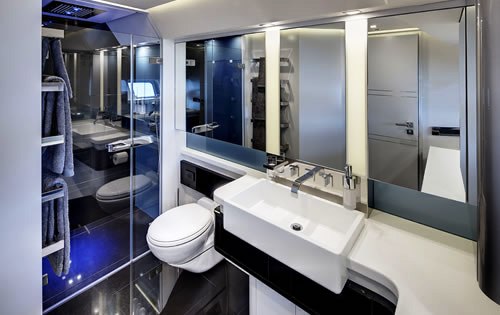 Her full width master cabin can be partitioned off to create a smaller master cabin plus twin bunk cabin arrangement. The “his and hers” ensuite bathrooms in the master cabin in full cabin mode become an ensuite for the master and an ensuite for the bunk cabin when the partition is in place.