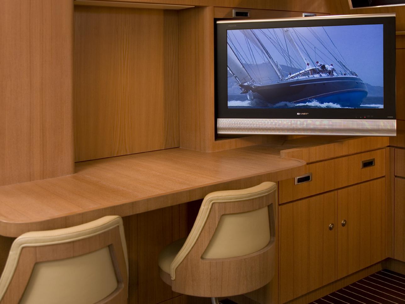 Her interior features whitewashed teak with brushed stainless steel detailing which achieves a light, modern atmosphere.
