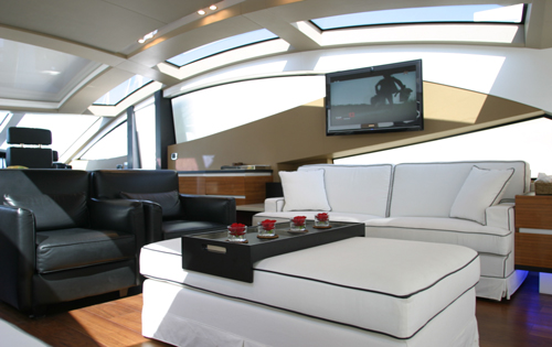 The salon features a unique arched aerodynamic ceiling, dark wood floors bring an old world charm, while crisp white and black leather soft furnishings create the modern feel; plenty of natural sunlight flows in through skylights, windows and the aft door leading to the large aft deck.
