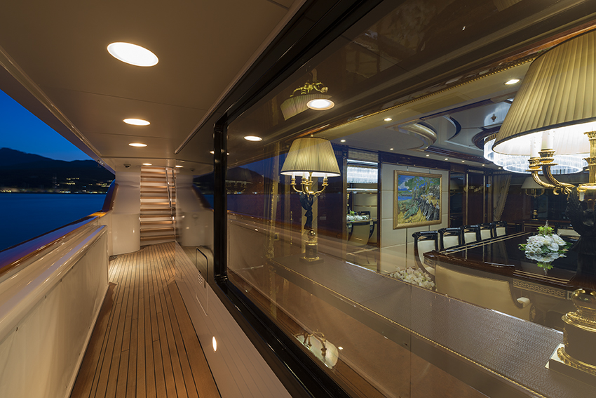 The master suite features panoramic views, dressing room, lounge area, study and his and ger ensuite facilities with Jacuzzi. The VIP cabin is located on the bridge deck and features a king-size bed and spacious ensuite facilities with a Jacuzzi tub.