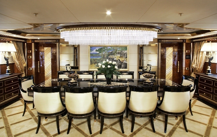The extravagant interior decor predominantly features black and cream colour palette with leather crocodile patterns, gold accents and other lavish elements.