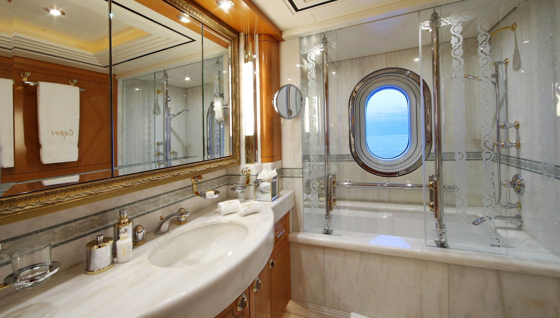 Luxury yacht CAPRI boasts a master suite with king size bed and a Spa Pool bathtub in the his and hers private ensuite. In the suit there is also a private office and ...