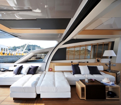 A large glass covered enclosure over the bridge flows onto the open deck space. Her superstructure offers uninterrupted view with no visible divisions between exterior and interior living spaces while still allowing for protection from the elements via her glass folding aft doors, shown in the photos below.