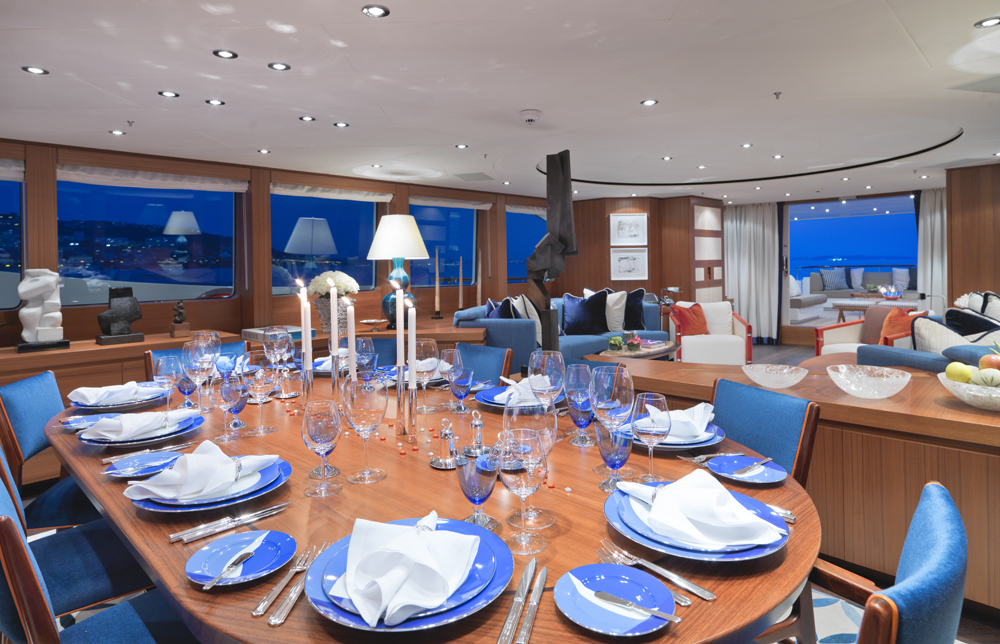 Her main salon features two sofas in an open plan arrangement with an adjoining dining area which is divided by a built-in dry bar and large retractable flat-screen TV and with DVD payer. The dining area has a large table seating up to 10 guests.