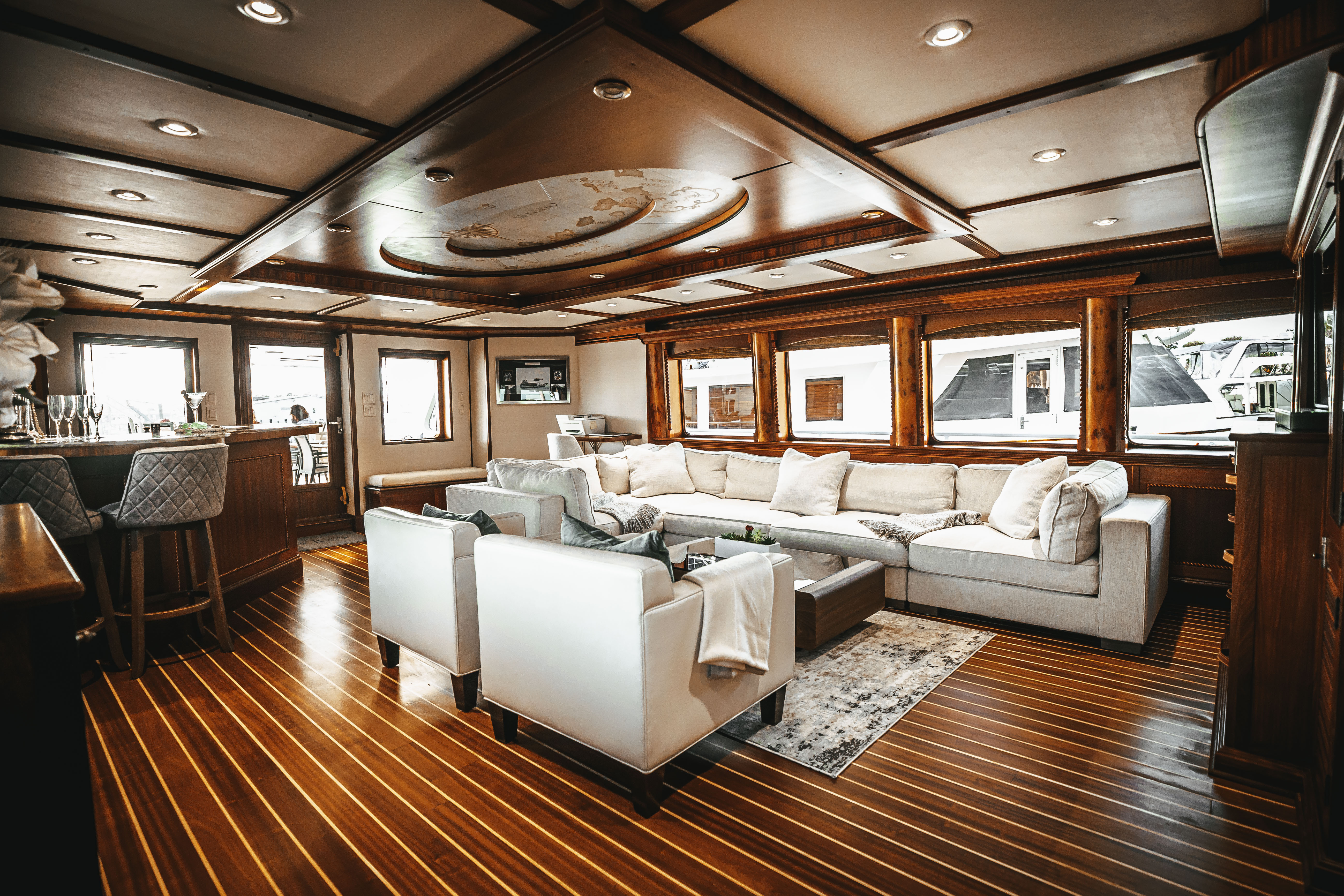 She was Trinity’s Hull number 1 and is known for her fabulous outdoor entertaining areas. Her covered aft deck features an over-sized al fresco dining area, wet bar, refrigerator, icemaker, a 46” plasma TV and access to cockpit, swim platform and sundeck. There is a fish fighting Chair fixed on the swim platform.