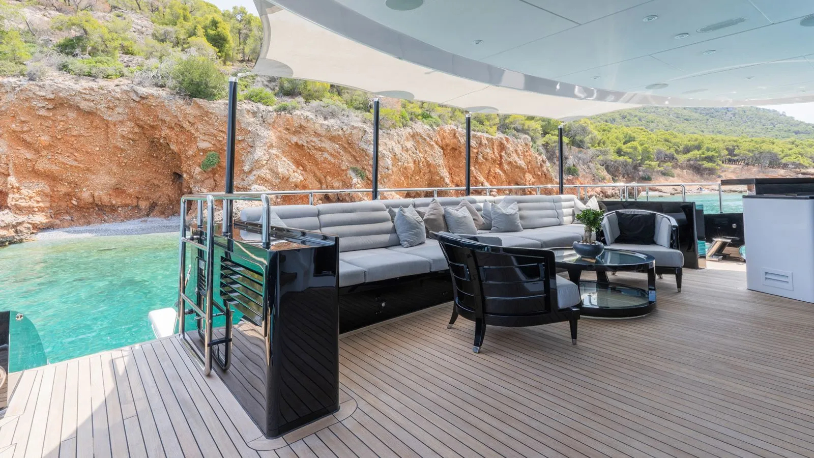 The elegant dining area with a circular table and stylish black leather chairs is located at the aft of the vessel, toward the main deck aft. The upper lounge features a long, mirrored bar and mirror insets between the windows cleverly providing an uninterrupted view.
