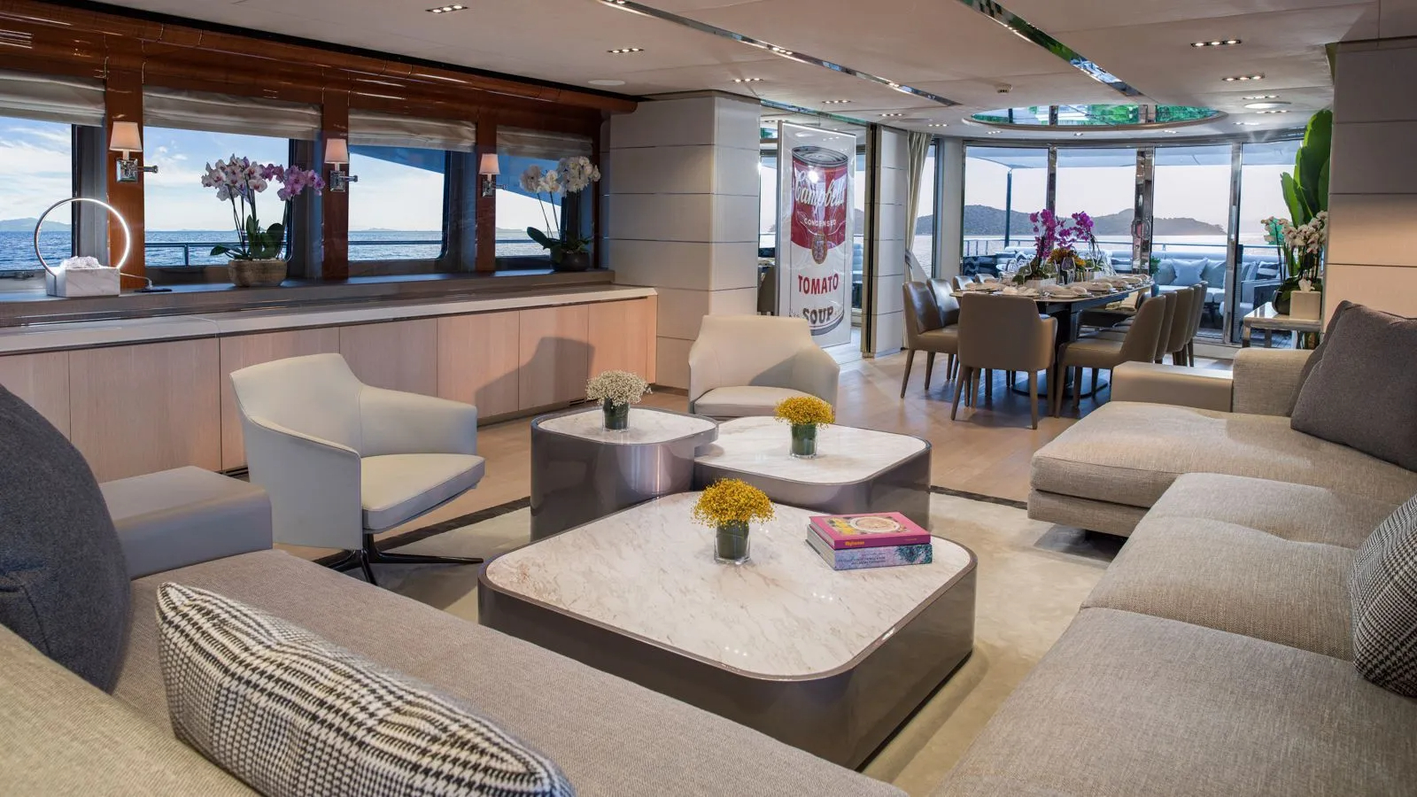 The elegant dining area with a circular table and stylish black leather chairs is located at the aft of the vessel, toward the main deck aft. The upper lounge features a long, mirrored bar and mirror insets between the windows cleverly providing an uninterrupted view.