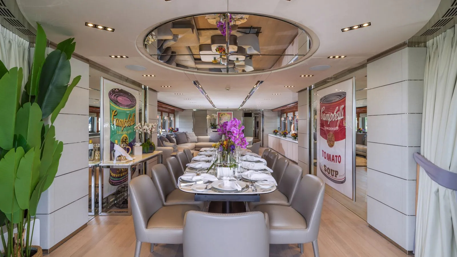 The elegant dining area with a circular table and stylish black leather chairs is located at the aft of the vessel, toward the main deck aft. The upper lounge features a long, mirrored bar and mirror insets between the windows cleverly providing an uninterrupted view.