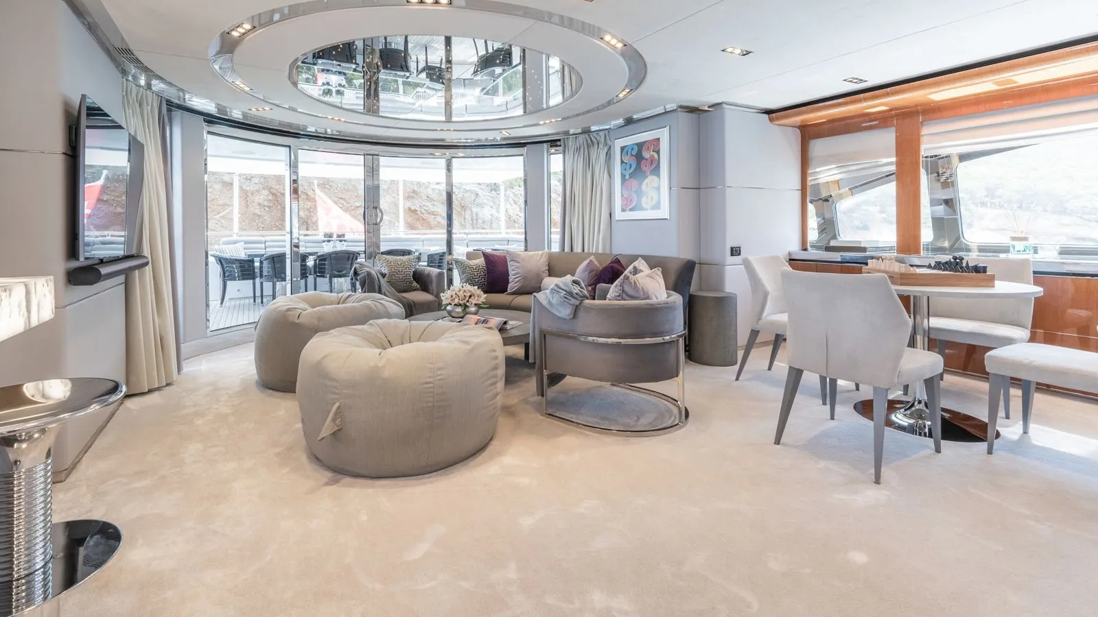 The elegant dining area with a circular table and stylish black leather chairs is located at the aft of the vessel, toward the main deck aft. The upper lounge features a long, mirrored bar and mirror insets between the windows cleverly providing an uninterrupted view.