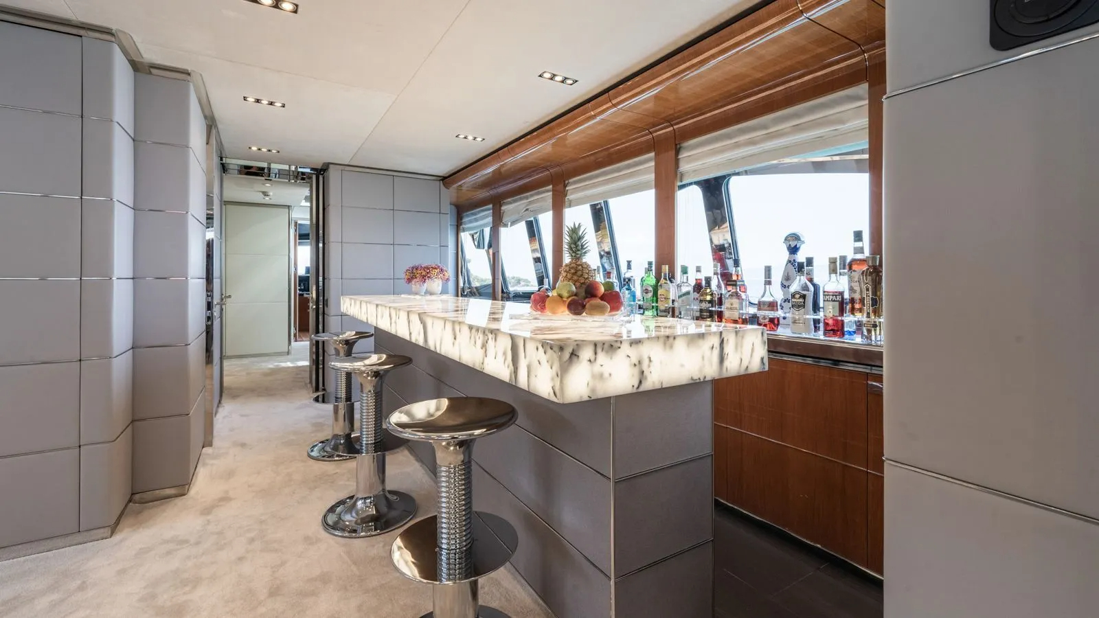 The elegant dining area with a circular table and stylish black leather chairs is located at the aft of the vessel, toward the main deck aft. The upper lounge features a long, mirrored bar and mirror insets between the windows cleverly providing an uninterrupted view.