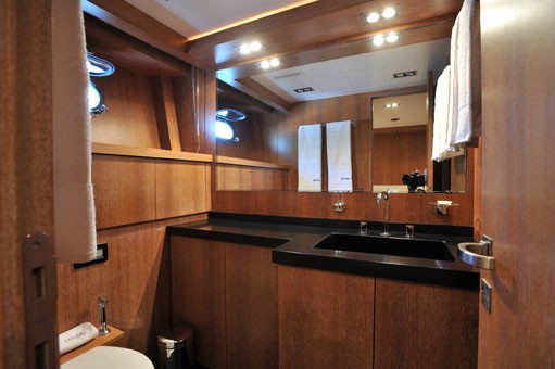 Her Master cabin is located aft and has no less than ten windows giving, a light bright and spacious feel. Alternatively, blinds may be lowered for a more intimate atmosphere and privacy. The shower in the ensuite of this cabin is large enough for a two people. There are 3 further cabins, including a VIP, a triple and a double cabin.