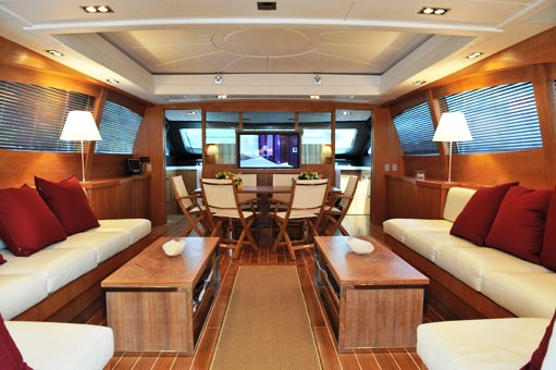 The salon layout features 2 L shaped lounges opposite each other as you enter from the aft. Further forward is the dining area. The comfortable furnishings and layout allows for casual living or a formal dining party for eight or ...