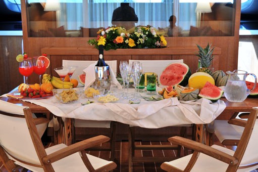 Further forward is the dining area. The comfortable furnishings and layout allows for casual living or a formal dining party for eight or ten guests.