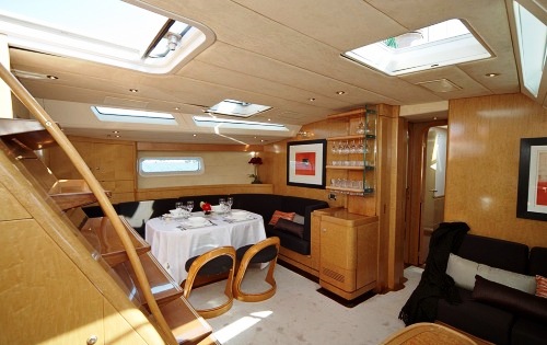 Her main salon is a comfortable area with skylights above offer extra light and a sense of space. On the port side of the salon is a dining area with a u shaped couch, table and 2 freestanding chairs. On the starboard side is a another u shaped couch for lounging and watching the large LCD TV screen.