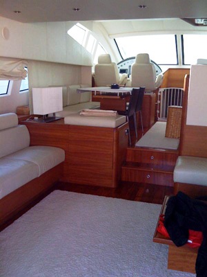 The yachts main deck interior features a salon with couch, the dining area, galley and wheelhouse all in the same area. The salon has a 20” Plasma TV screen and a white leather sofa. The interior is light and bright and has been maintained impeccably.