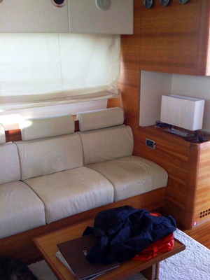 The yachts main deck interior features a salon with couch, the dining area, galley and wheelhouse all in the same area. The salon has a 20” Plasma TV screen and a white leather sofa. The interior is light and bright and has been maintained impeccably.