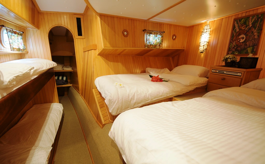 The Jungle Room and Singing Monkey suite are two fore cabin suites are ideal as family rooms, as each have large double beds, which are convertible to singles with advance notice. There are two bunk beds in each cabin, the lower being possible for an adult, and the upper bunk for a child. There are safety bars and ladder.