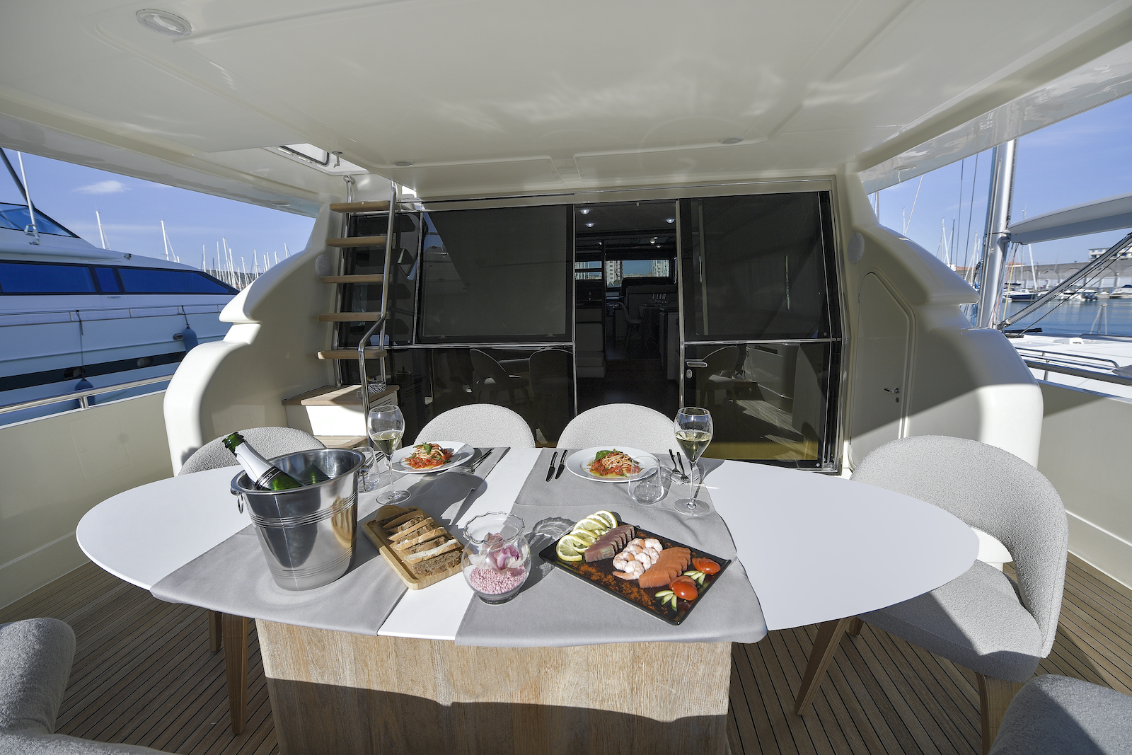 The Ferretti CELINE boasts a wide saloon with comfortable settees to relax in front of the TV and an adjoining dining area with modern chairs able to seat 8 guests. Accommodation below deck includes a spacious double Owner's cabin with en suite bathroom, a double VIP cabin and 2 twin cabins, all with en suite bathroom.