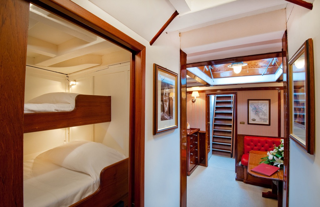 Classic sail charter boat ORIANDA can accommodate up to 8 guests in 4 cabins. There are two queen sized double cabins with en-suite facilities at the stern and forward of the saloon there are two twin cabins with upper and lower beds. These two cabins share a bathroom between them.