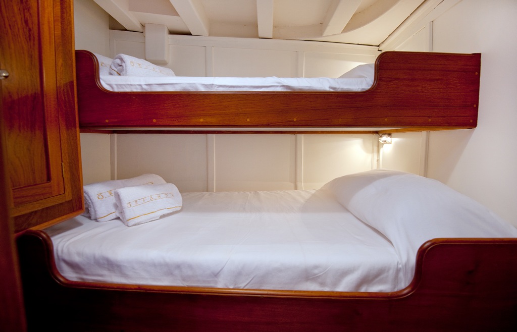 Classic sail charter boat ORIANDA can accommodate up to 8 guests in 4 cabins. There are two queen sized double cabins with en-suite facilities at the stern and forward of the saloon there are two twin cabins with upper and lower beds. These two cabins share a bathroom between them.