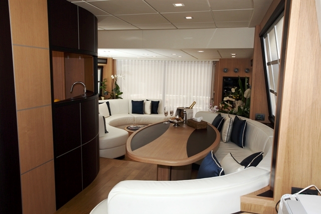Motor yacht GABY’s main salon is stylish and spacious with a large u shaped couch to starboard, and a large u shaped couch to port further forward in the dining area, mirroring the salons layout. With crisp white leather couches, light wood and the large windows, her salon is spacious, chic and comfortable.