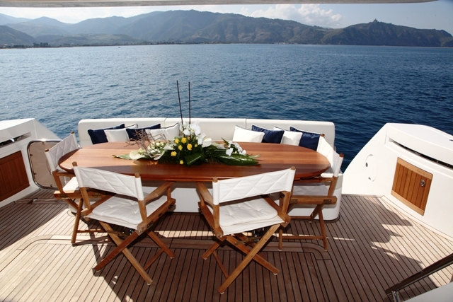 Motor yacht GABY also features spacious exterior areas, especially her fly bridge which has space for dining el fresco and sunbathing.