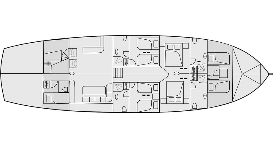 The below-deck layout hosts the guests and crew accommodation along with the engine room, laundry facilities and storage for water toys.