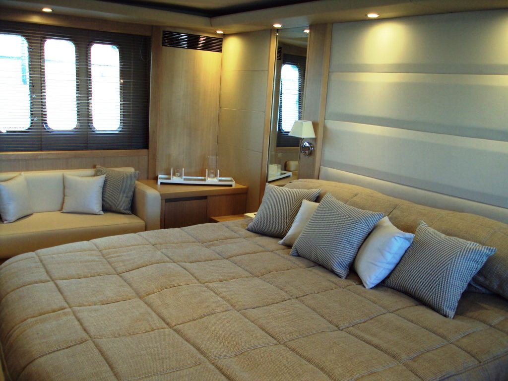 The saloon offers comfortable seating on stylish leather covered sofa with the latest entertainment systems at hand, while the forward dinette doubles as an additional seating area for guests while underway.