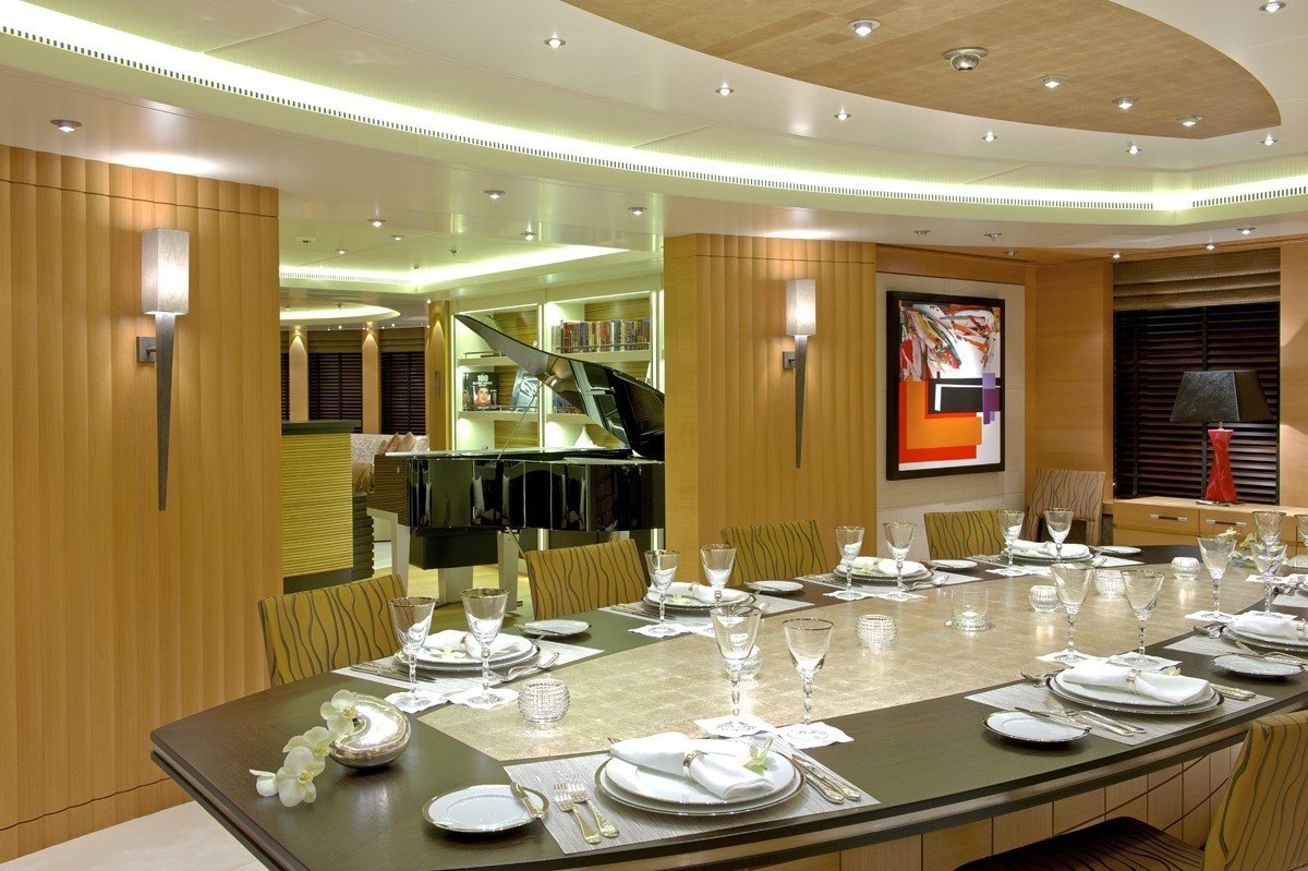 Opening of the main lounge a full-beam dining area seating fourteen, incorporates a stunning fumed oak and silver leaf table.