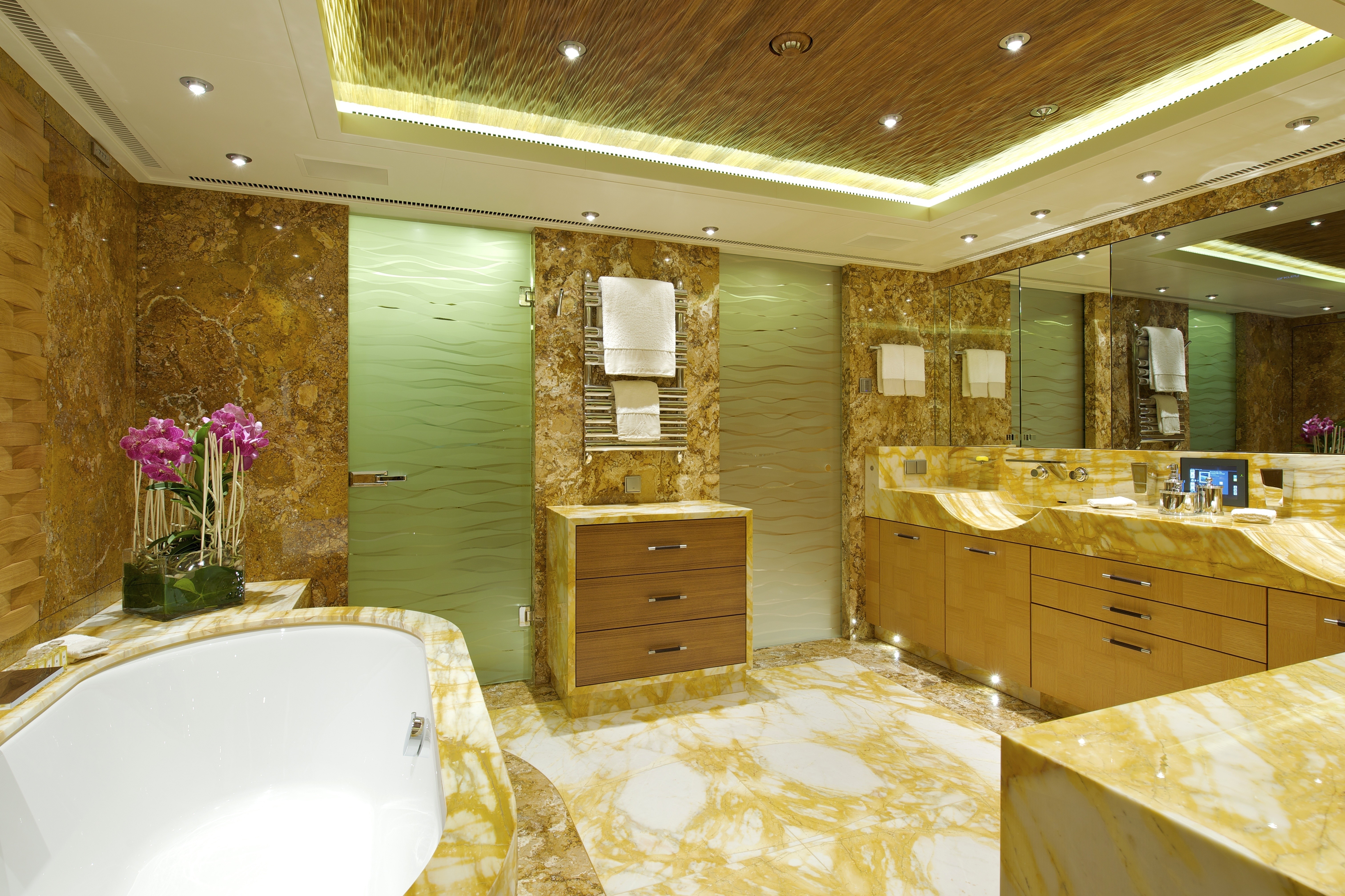 Upper deck saloon is an engaging open plan spacious lounge and bar area fitted out with game tables and two 61-inch HD flat screen TV's. The stunning custom made exterior dining table which seats twelve incorporates a central revolving section further aft.
