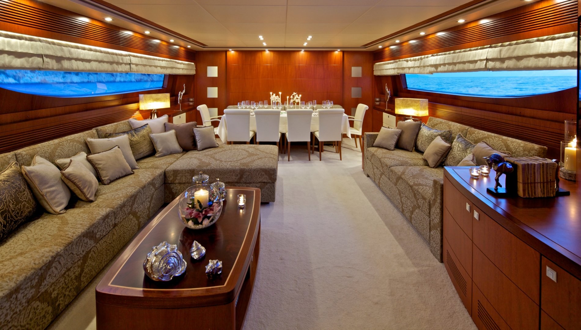There is a large salon with a lounge and dining areas, where charter guests can relax after a long day of adventure, or taste some mouth-watering delights and celebrate in style.