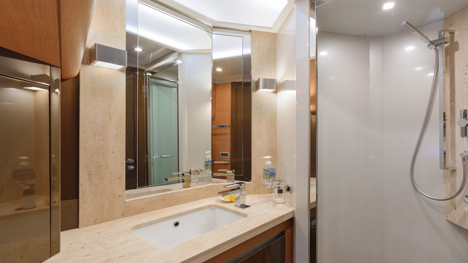 The cabin is fitted with a comfortable wardrobe and two bathrooms, interconnecting through a wide shower room. The VIP cabin and the two Guest cabins are elegant, each with their own private bathroom with the showers fitted with crystal doors.