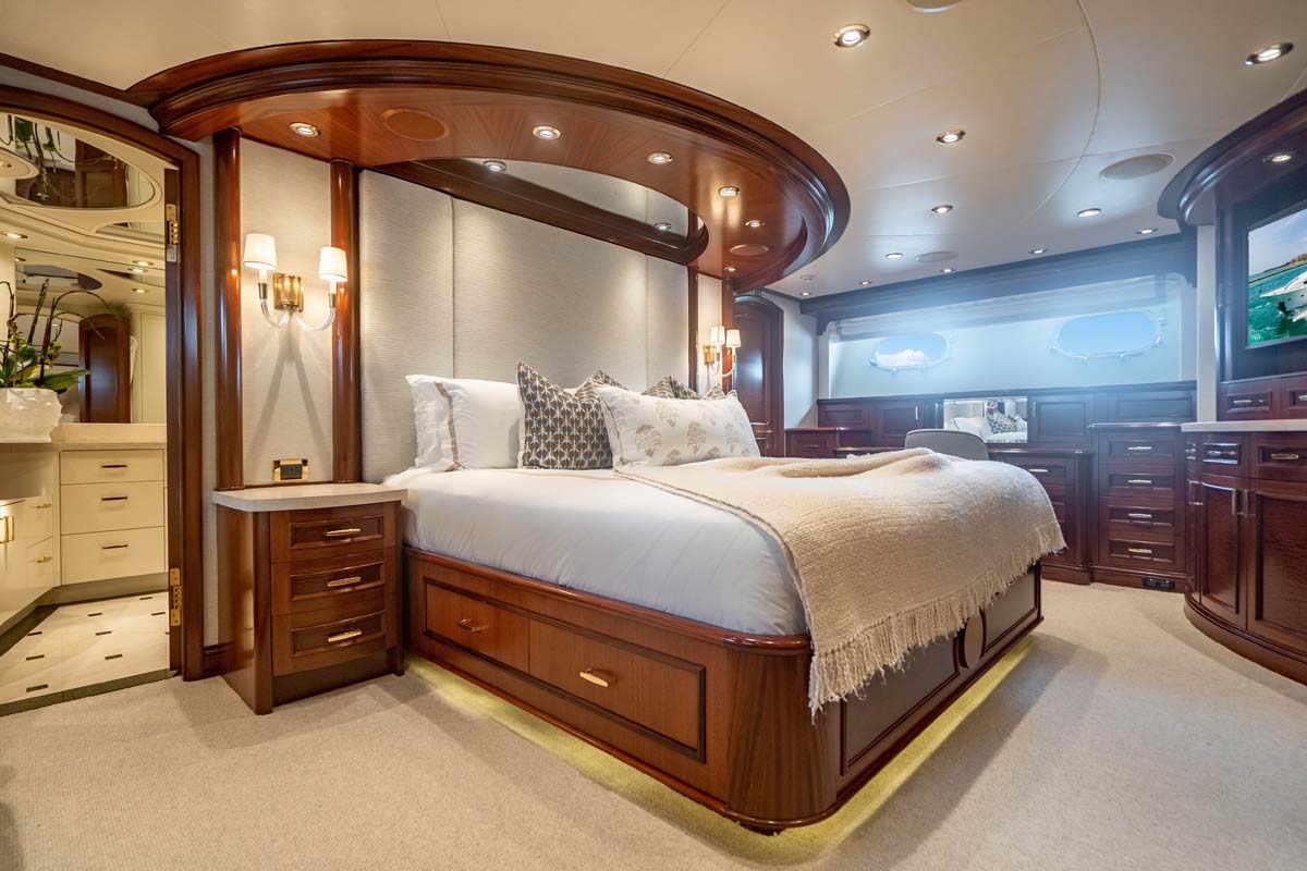 The VIP Stateroom is located forward and features a Queen-sized bed with ample storage, cedar lined closet, a 27” flat-screen TV with DVD and iPod docking station plus an ensuite head with shower, marble countertop and flooring.