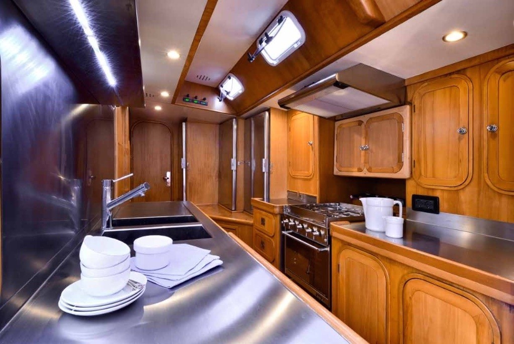 There are two guest staterooms each with a lower double bed and a single upper bed and a fourth stateroom that is situated aft of the salon has a double bed and an additional Pullman bed. All cabins have a bathroom ensuite.