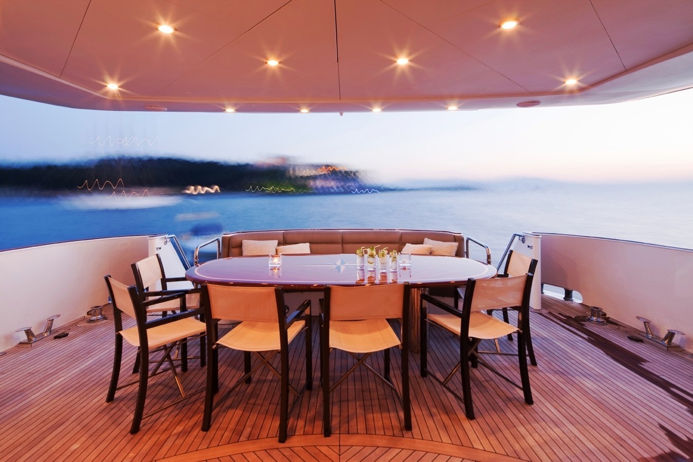 The formal dining area is situated forward of the salon. A completely refitted day head with onyx marble is forward to port down a short corridor. Forward to starboard down a short corridor is the galley.