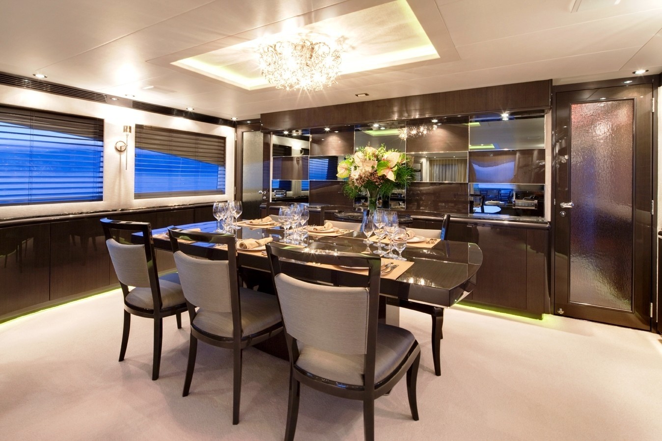 The formal dining area is situated forward of the salon. A completely refitted day head with onyx marble is forward to port down a short corridor. Forward to starboard down a short corridor is the galley.