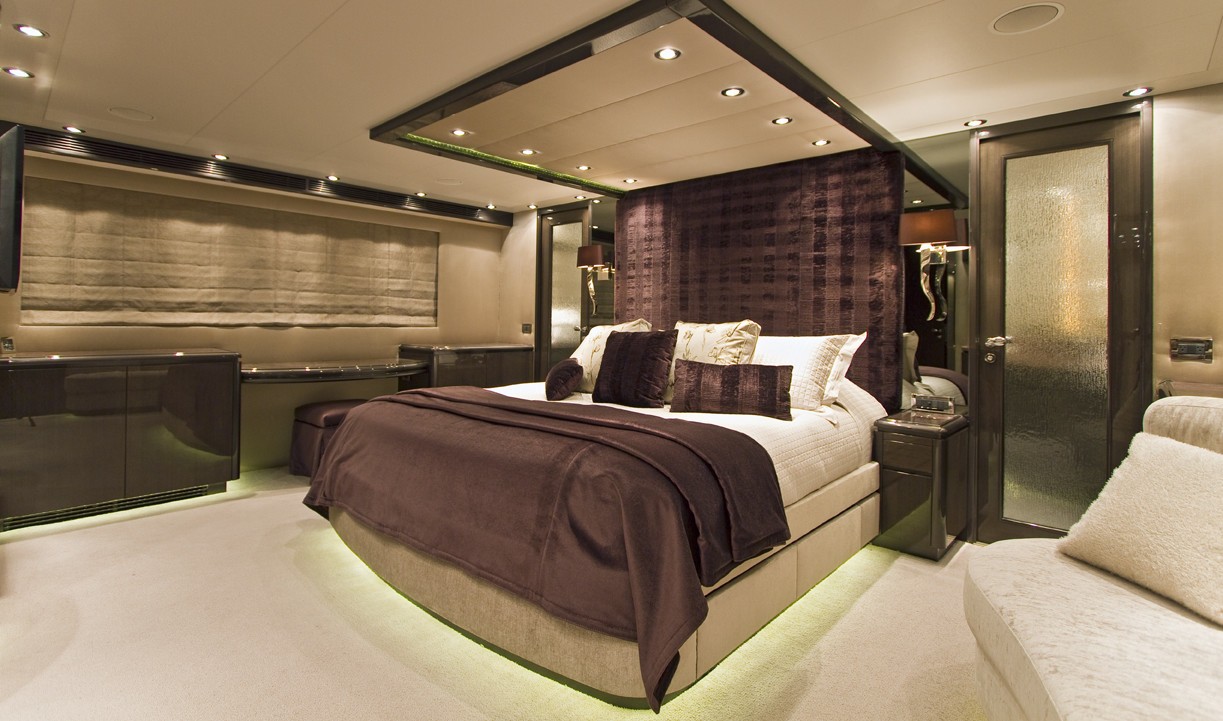 The cabin has six large portholes to port and starboard giving plenty of natural light. There are electrically operated blackout shades which will completely darken the stateroom, great for when in port or for an afternoon nap. There is a Settee on the starboard side and a Vanity to port.